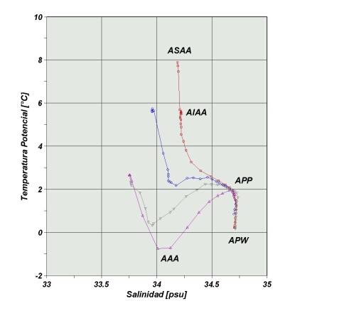 ASSA: AGUA SUPERFICIAL SUBANTÁRTICA. ASAA: AGUA SUPERFICIAL ANTÁRTICA. AIAA: AGUA INTERMEDIA ANTÁRTICA. APP: AGUA PROFUNDA DEL PACIFICO. APW: AGUA PROFUNDA DEL MAR DE WEDDELL.