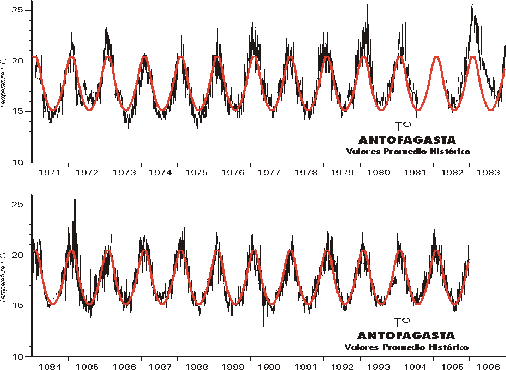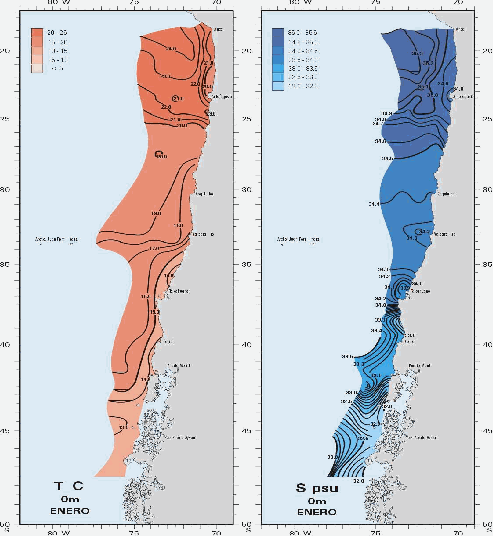 En el Atlas Oceanográfico de Chile - Volumen 1, la información histórica de temperatura superficial del mar registrada en estaciones fijas de la costa chilena es representada por medio de series de tiempo para valores diarios de TSM para determinadas localidades del país.