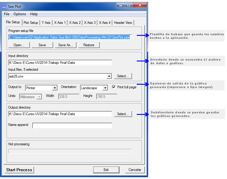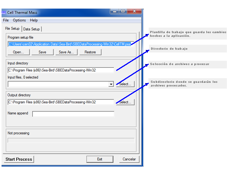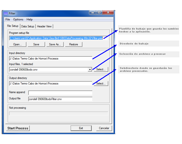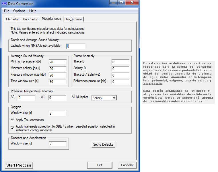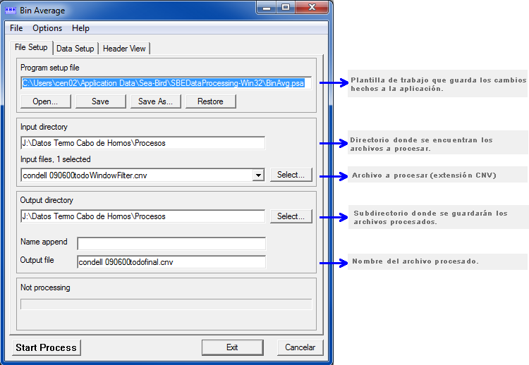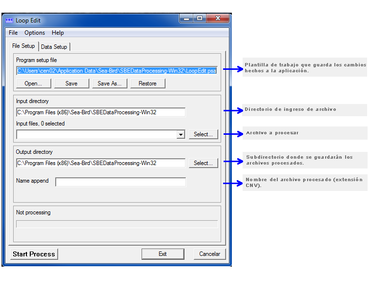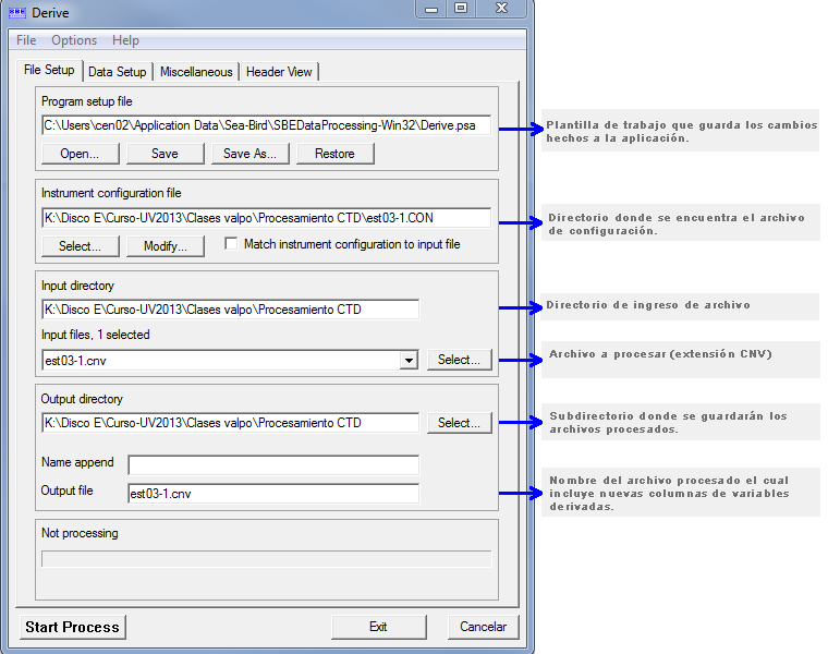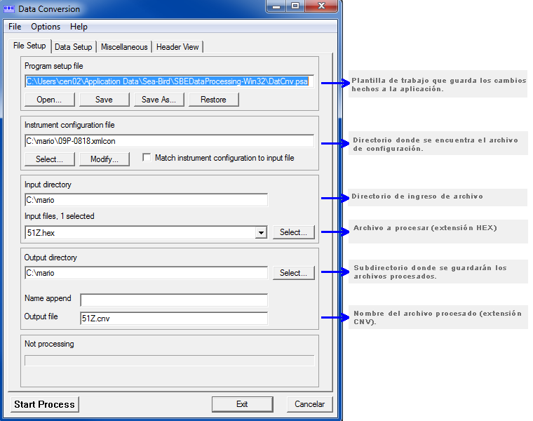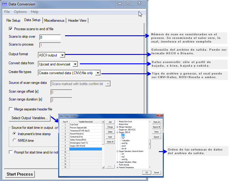 El uso de esta subrutina requiere de un archivo de configuración, que contiene toda la información de calibración del CTD (*.con y *.xmlcon).
