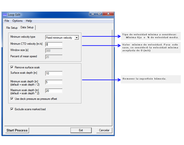 Una vez la conversión haya sido realizada, se debe revisar manualmente el archivo de datos, eliminando toda fila de observaciones asociadas a la estabilización de los sensores. Los datos finales deben partir desde el nivel más cercano a superficie, considerando un descenso a velocidad constante.